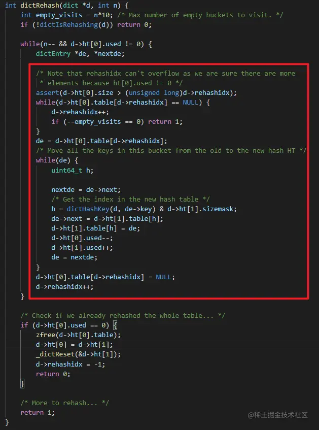 追到 dictRehash 函数的时候,可以看到此处的再 hash 函数 dictRehash,我们可以看到 rehash 的做法是: