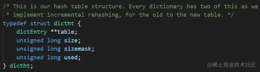 table 是一个二级指针,对应这一个数组,数组中的每个元素都是指向了一个 dictEntry 结构体指针的,dictEntry 具体的数据结构是保存一个键值对