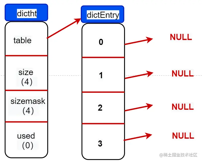 对于上述的案例,可以用一个简图来表示一下 hash 表结构 dictht