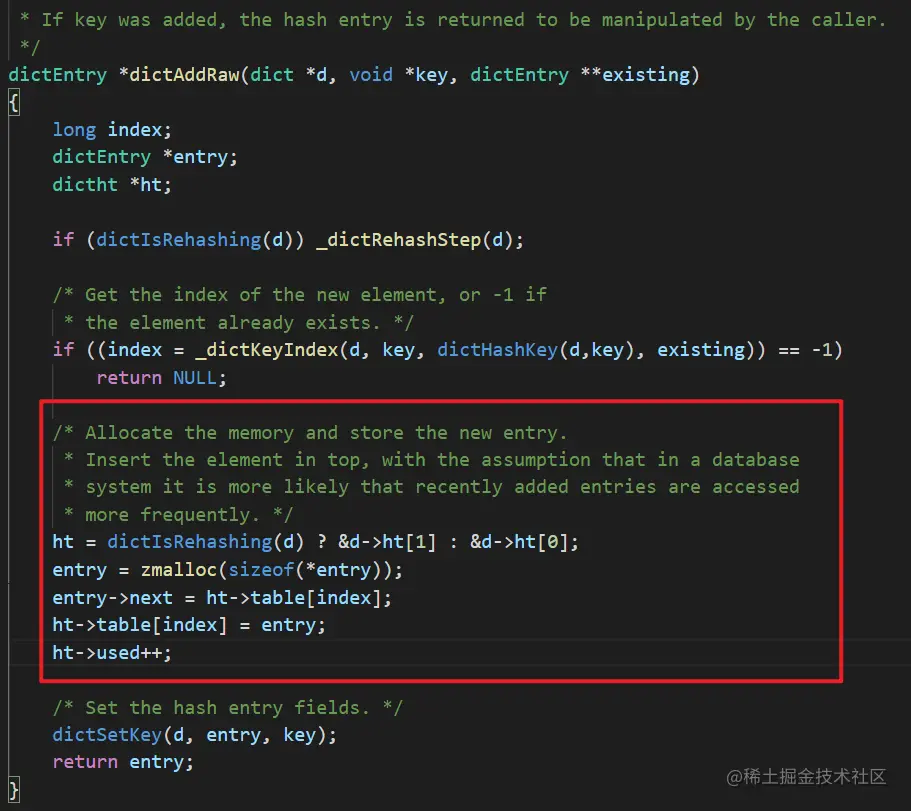 当追到 dictAddRaw 函数的时候,我们可以清晰的看出来,当 redis 加入数据的时候,使用的是头插法