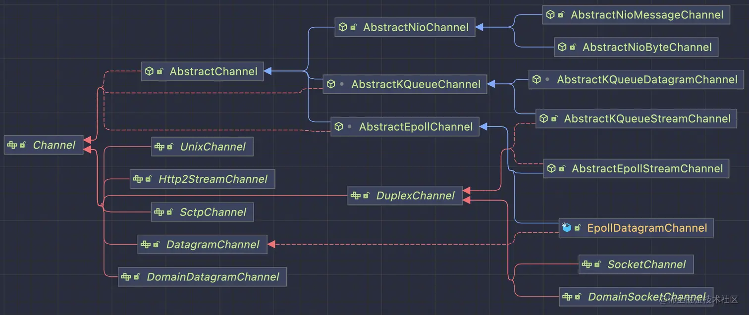 另外一个channel的非常重要的子类就是AbstractChannel,AbstractChannel有三个非常重要的实现,分别是AbstractNioChannel,AbstractKQueueChannel和AbstractEpollChannel。