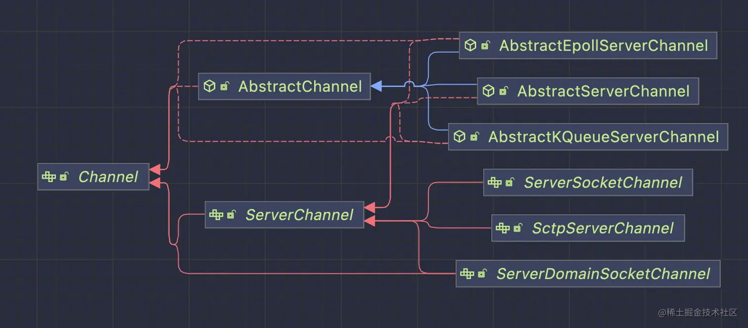 从上图我们可以看出,ServerChannel有六个抽象类实现,分别是AbstractEpollServerChannel,AbstractKQueueServerChannel,AbstractServerChannel,ServerSocketChannel,SctpServerChannel和ServerDomainSocketChannel。