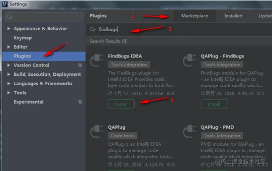 打开 IDEA,点击左上角的 File—Settings 进入设置界面,然后点击 Plugins 进入插件窗口,直接联网进行搜索 findbugs,点击 Install 安装。详情见下图的操作截图。