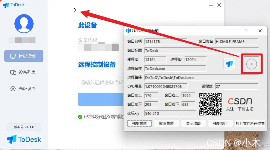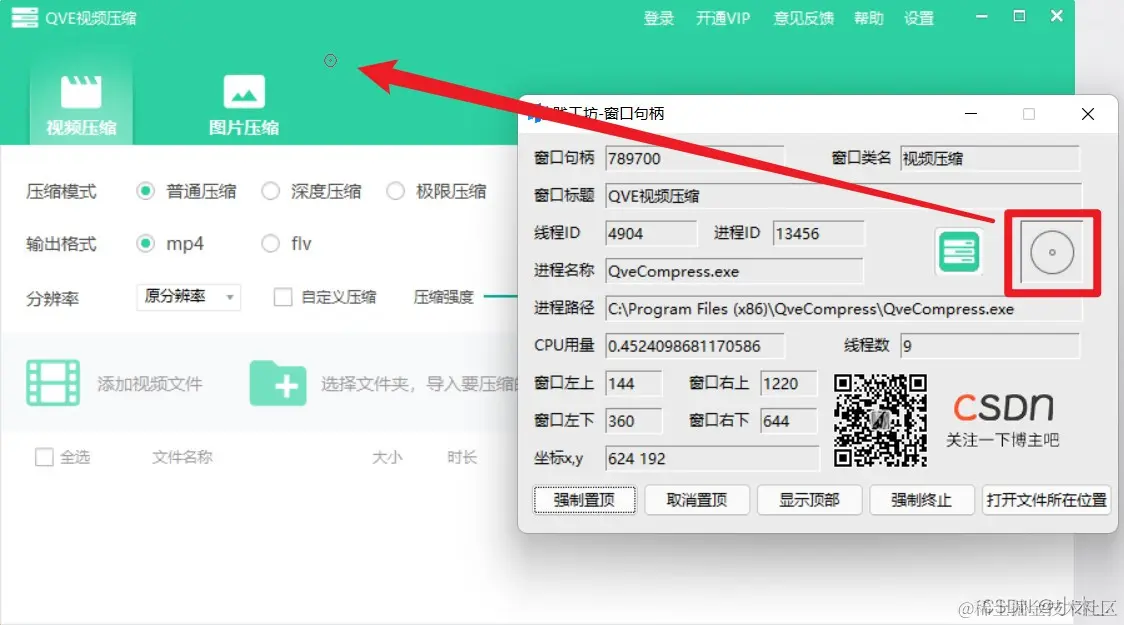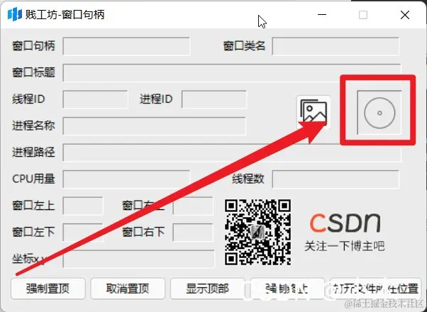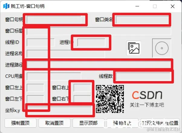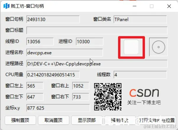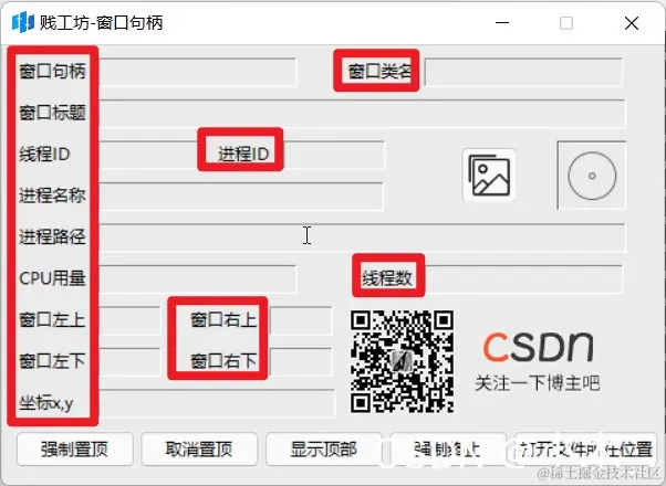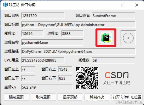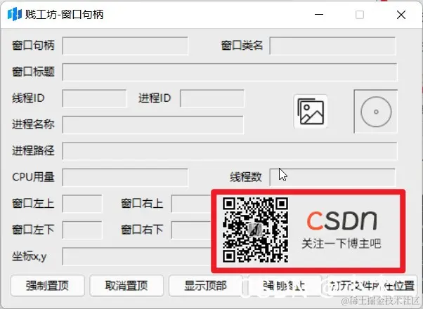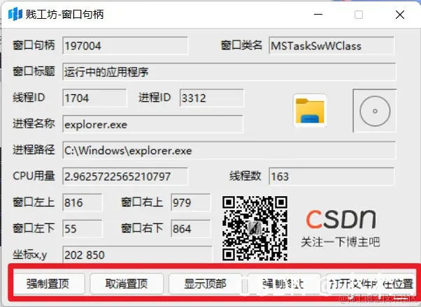 GUI窗口 使用鼠标指针进行定位程序,获得程序的窗口句柄、窗口类名、窗口标题、线程ID、进程ID、进程名称、进程路径、CPU用量、线程数、窗口定位及鼠标坐标,并附加五项可操作控件,强制置顶、取消置顶、显示顶部、前置终止、打开文件所在位置,可显示定位程序的图标。