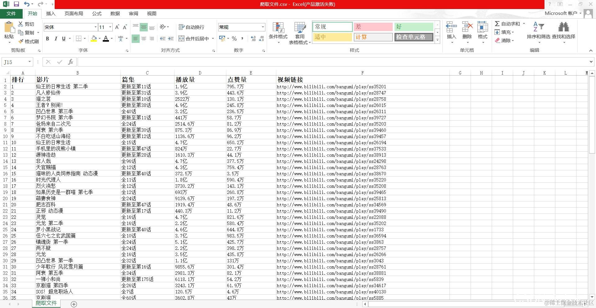 排名、视频名、视频集数、播放量、点赞量及视频链接,爬取完后要存储到csv文件内