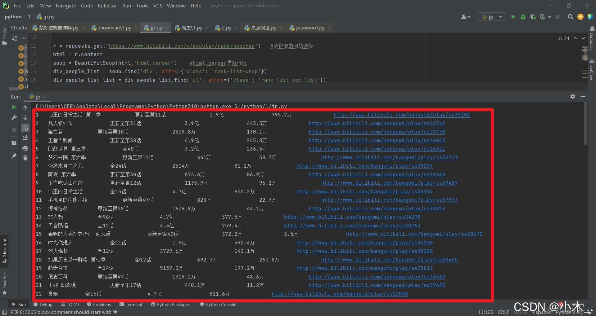 r = requests.get('https://www.bilibili.com/v/popular/rank/guochan') #要爬取的网站链接