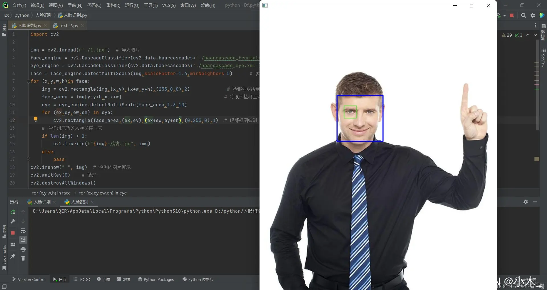 face_area = img[y:y+h,x:x+w] # 将眼部检测区域范围缩小,减少检测时间