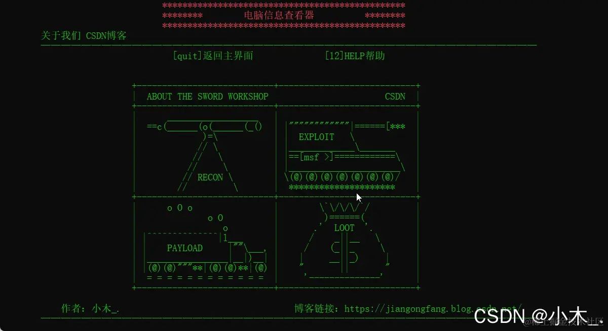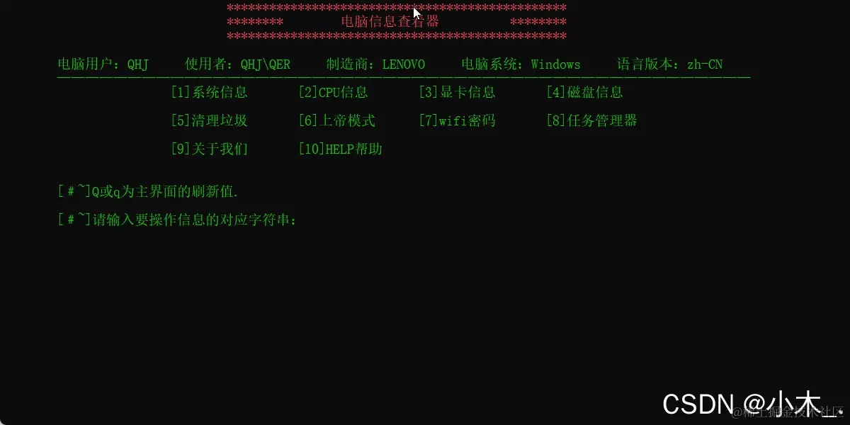 电脑信息查看器,DOS 窗口操作,全程都是DOS窗口,内置操作 系统信息、CPU信息、显卡信息、磁盘信息、清理垃圾、上帝模式、wifi密码、任务管理器等几项常规操作信息