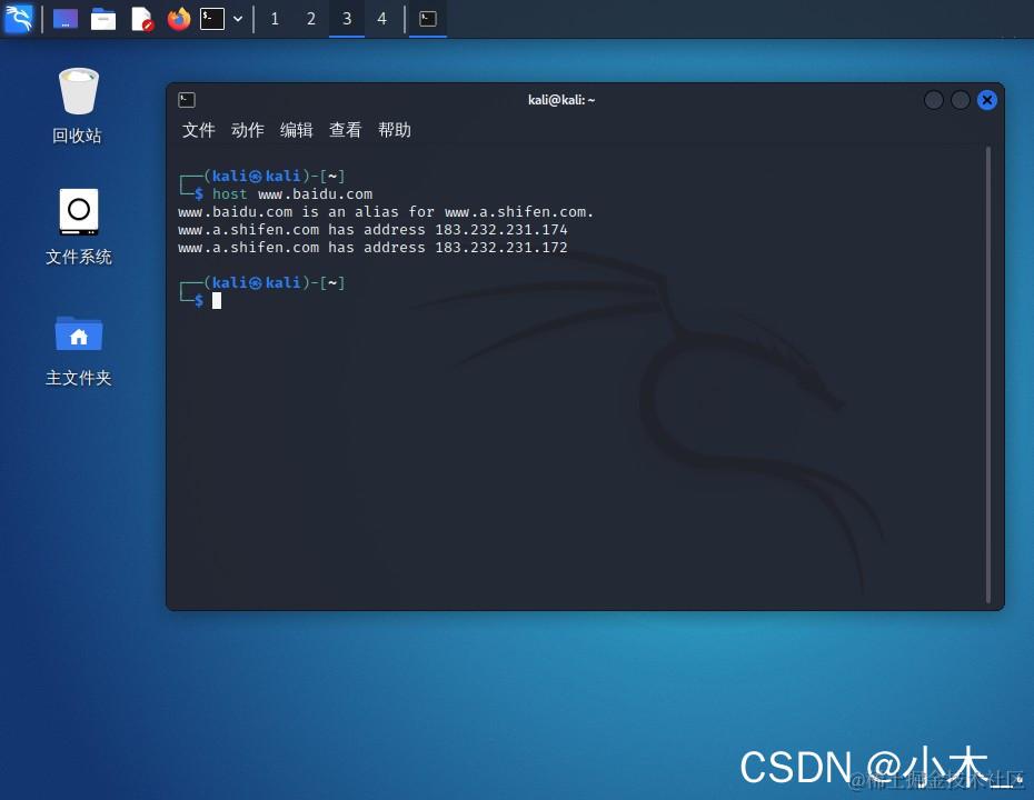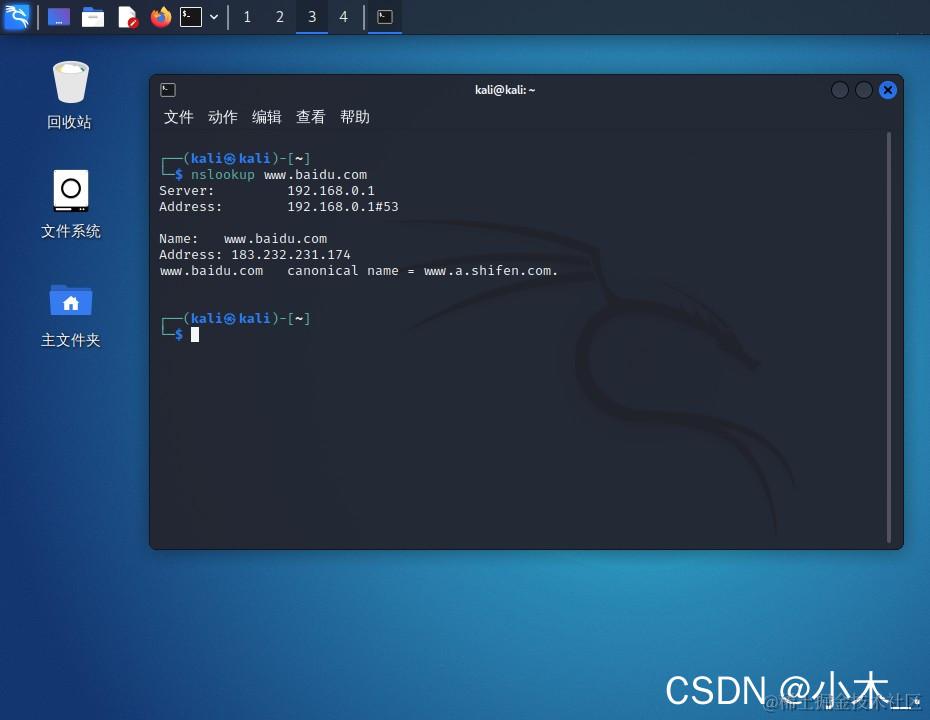 【实战模拟】使用Kali Linux进行域名解析——模拟测试 已注销 2022-02-27 342 阅读1分钟 1、ping解析 ping 域名或IP 2、host解析 host www.baidu.com 3、nslookup解析 nslookup www.baidu.com 4、dig解析