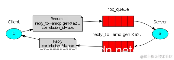 reply_to和correlation_id,reply_to用于指定回调队列,correlation_id用于识别回调队列中的消息对应的是哪一个请求(确定请求源)- 客户端发送请求到