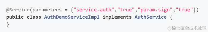 敏感服务自身在发布的时候,只需要导入本应用证书到classpath下,并在具体Service上配置好鉴权相关的参数即可,如下所示: