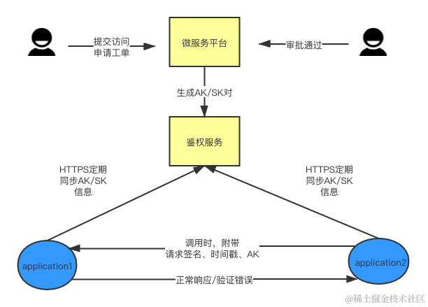 2. 之后在管理站点上提交工单,申请某个敏感业务服务的使用权限,并由对应业务管理者进行审批,审批通过之后,会生成对应的AK/SK到鉴权服务中心。
