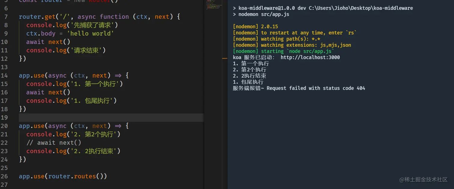 - 必须调用 next 方法后面的方法才会执行,否则洋葱模型就结束了