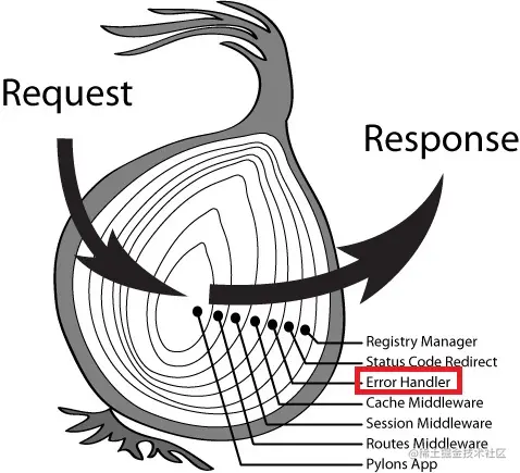 图中的一层一层的“方法”称为 中间件,比如 Cache Middleware ,Routers Middleware 就是一个个中间件
