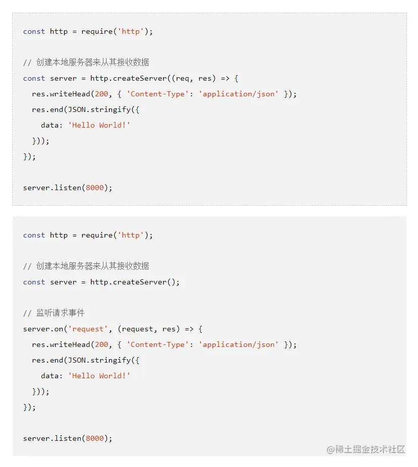 额外小知识 在 http.createServer 传入的回调函数和 server.on('request') 是一样的效果