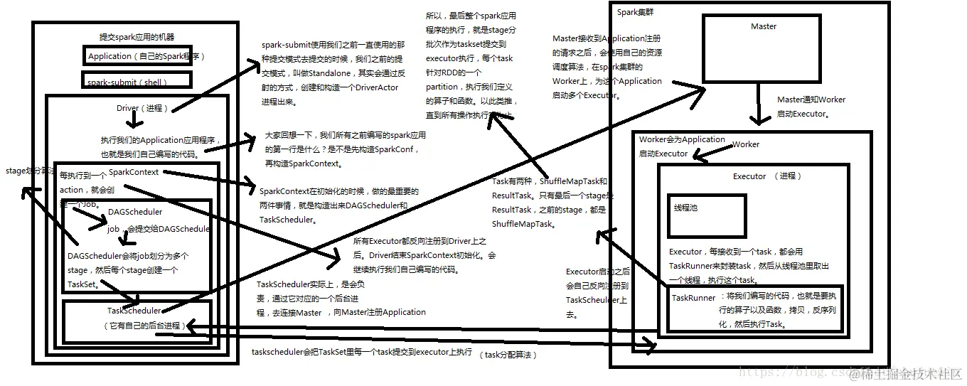 3)SparkContext 构建成 DAG 图,将 DAG 图分解成 Stage,并把 Taskset 发送给 TaskScheduler。Executor 向 SparkContext 申请 Task,Task Scheduler 将 Task 发放给 Executor 运行同时 SparkContext 将应用程序代码发放给 Executor;