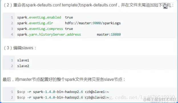 5)配置 spark 集群,修改 spark-env.xml,slaves 等配置文件,拷贝 hadoop 相关配置到 spark