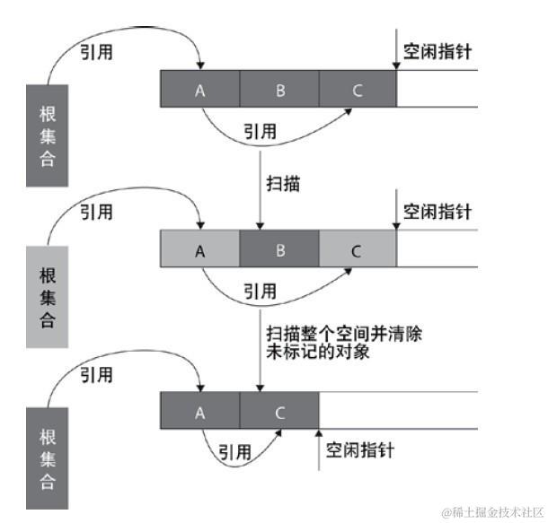 标记-整理算法采用标记-清除算法一样的方式进行对象的标记,但在清除时不同,在回收不存活的对象占用的空间后,会将所有的存活对象往左端空闲空间移动,并更新对应的指针。标记-整理算法是在标记-清除算法的基础上,又进行了对象的移动,因此成本更高,但是却解决了内存碎片的问题。具体流程见下图: