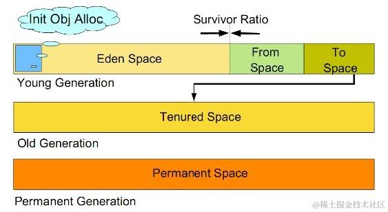 b) 新生代内存按照8:1:1的比例分为一个eden区和两个survivor(survivor0,survivor1)区。一个Eden区,两个 Survivor区(一般而言)。大部分对象在Eden区中生成。回收时先将eden区存活对象复制到一个survivor0区,然后清空eden区,当这个survivor0区也存放满了时,则将eden区和survivor0区存活对象复制到另一个survivor1区,然后清空eden和这个survivor0区,此时survivor0区是空的,然后将survivor0区和survivor1区交换,即保持survivor1区为空, 如此往复。