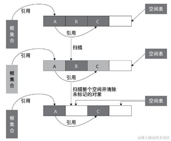 标记-清除算法采用从根集合(GC Roots)进行扫描,对存活的对象进行标记,标记完毕后,再扫描整个空间中未被标记的对象,进行回收,如下图所示。标记-清除算法不需要进行对象的移动,只需对不存活的对象进行处理,在存活对象比较多的情况下极为高效,但由于标记-清除算法直接回收不存活的对象,因此会造成内存碎片。