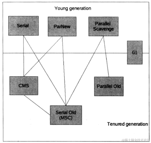 下面一张图是HotSpot虚拟机包含的所有收集器,图是借用过来滴: