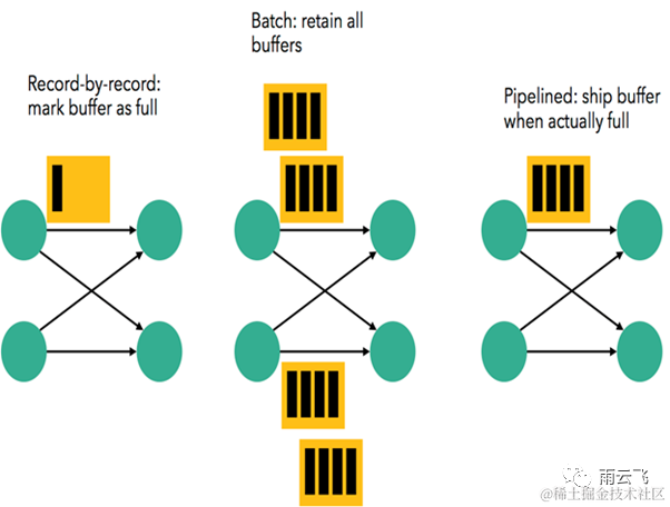 而对于一个批处理系统,其节点间数据传输的标准模型是:当一条数据被处理完成后,序列化到缓存中,并不会立刻通过网络传输到下一个节点,当缓存写满,就持久化到本地硬盘上,当所有数据都被处理完成后,才开始将处理后的数据通过网络传输到下一个节点。