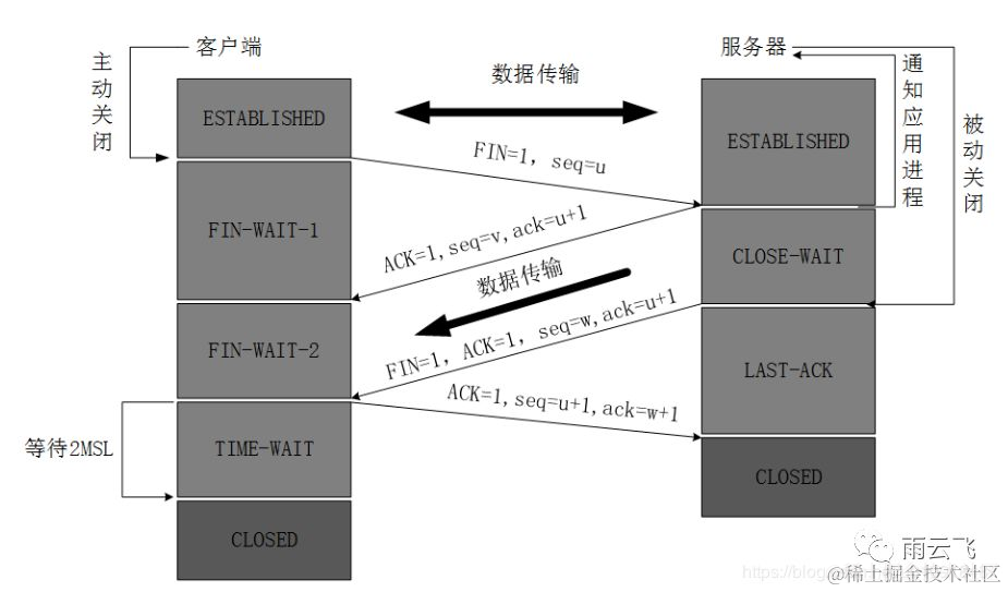 - 第四次挥手: 客户端收到回复后,发送确认ACK=1,ack=w+1,自己的seq=u+1,客户端进入TIME-WAIT(时间等待)。客户端经过2个最长报文段寿命后,客户端CLOSE;服务器收到确认后,立刻进入CLOSE状态。