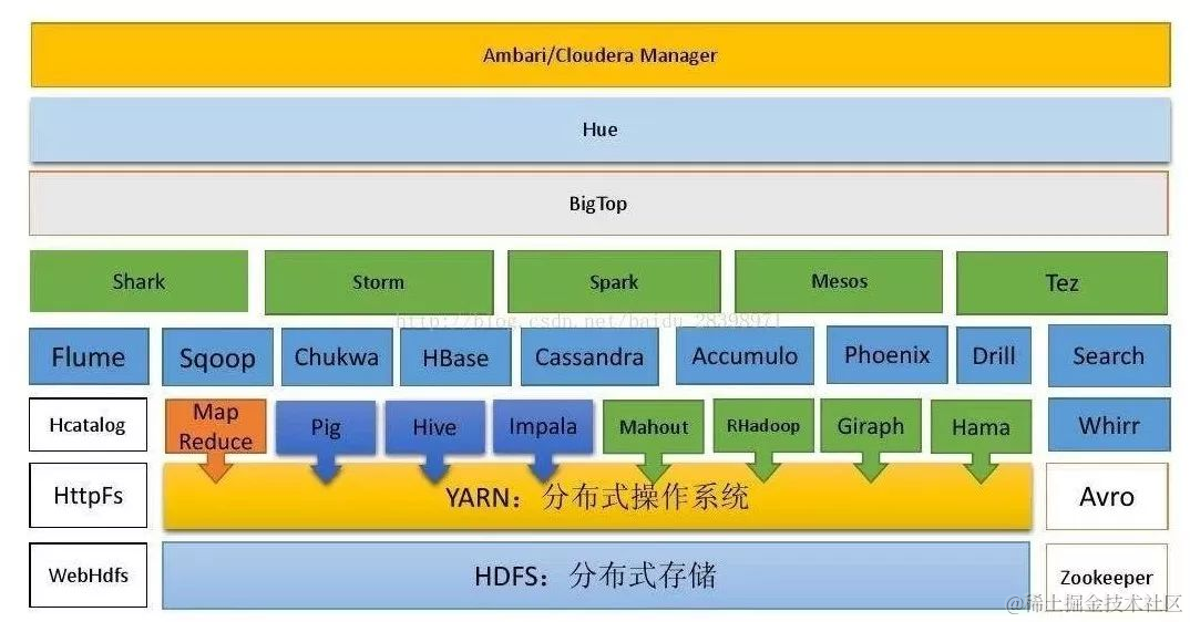 Hadoop是一个由Apache基金会所开发的分布式系统基础架构。Hadoop的核心是YARN,HDFS和MapReduce。Hdfs是分布式文件存储系统,用于存储海量数据;MapReduce是并行处理框架,实现任务分解和调度。Hadoop可以用来搭建大型数据仓库,对海量数据进行存储、分析、处理和统计等业务,功能十分强大。Hadoop具有成熟的生态系统,包括众多的开源工具,如下图:
