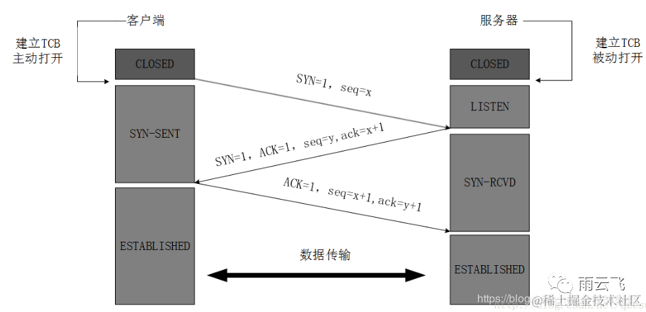 - 第一次握手: 客户端发送初始序号x和syn=1请求标志