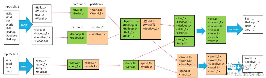 - (7)相同的分区的数据会进入同一个reduce。这一步中会从所有map输出中抓取某一分区的数据,在抓取的过程中伴随着排序、合并。