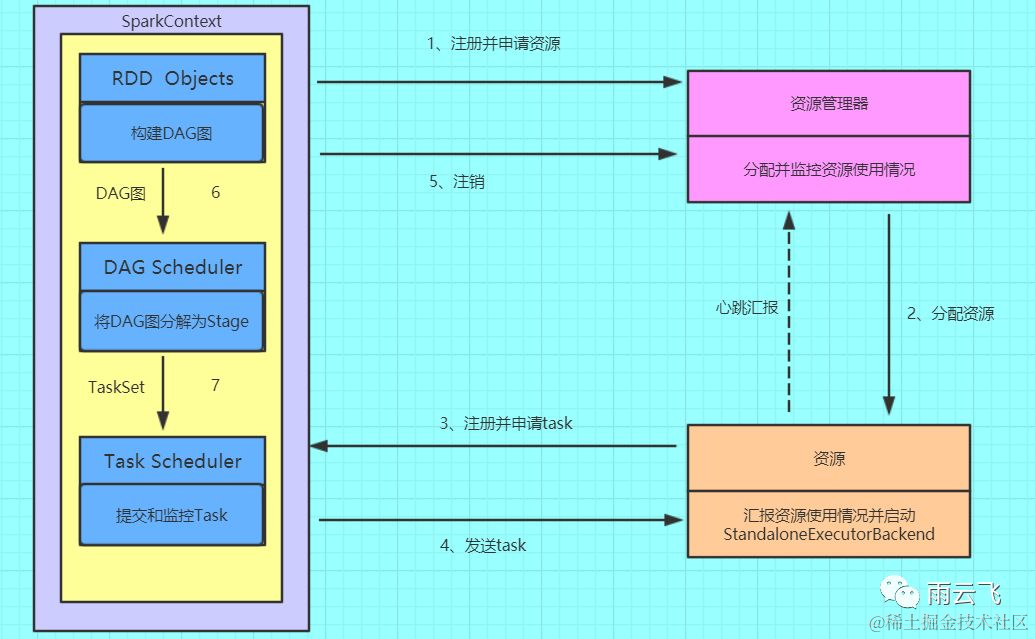 - (2)资源管理器分配Executor资源并启动StandaloneExecutorBackend,Executor运行情况将随着心跳发送到资源管理器上;