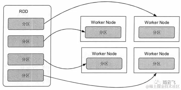 通俗点来讲,可以将 RDD 理解为一个分布式对象集合,本质上是一个只读的分区记录集合。每个 RDD 可以分成多个分区,每个分区就是一个数据集片段。一个 RDD 的不同分区可以保存到集群中的不同结点上,从而可以在集群中的不同结点上进行并行计算。下图展示 RDD 的分区及分区与工作结点(Worker Node)的分布关系。
