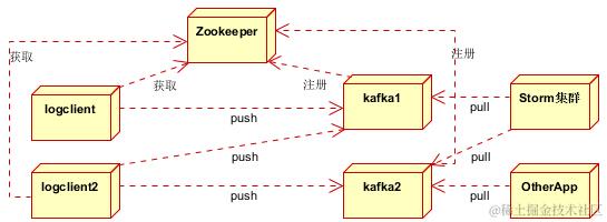 分为Zookeeper注册中心,日志收集客户端,Kafka集群和Storm集群(OtherApp)四部分组成。