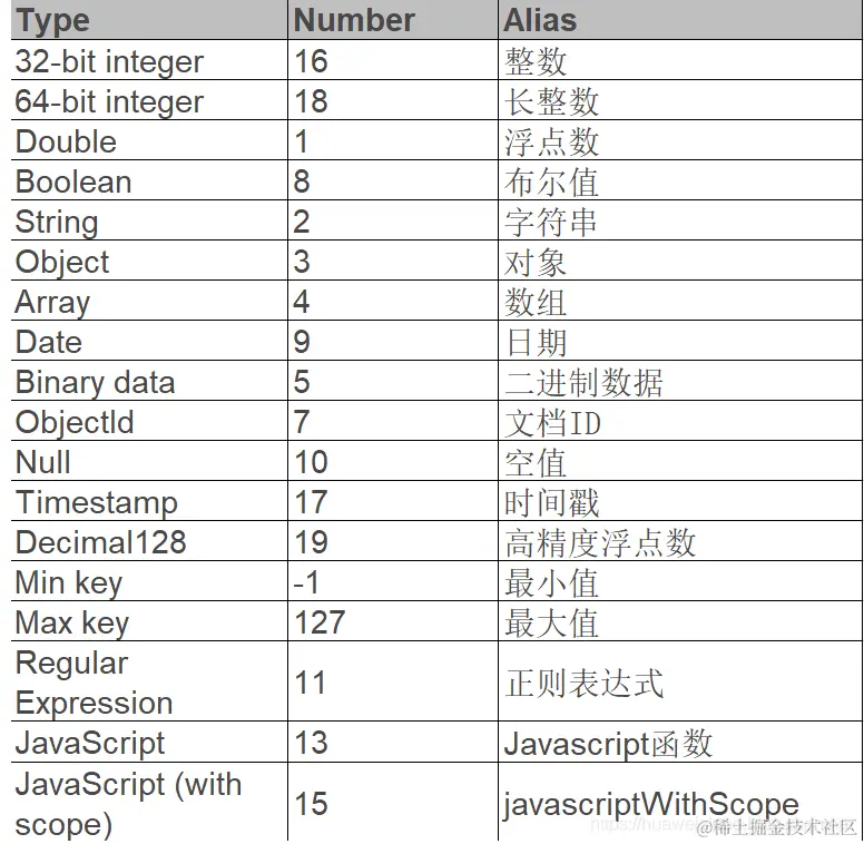 BSON 所支持的数据类型包括: