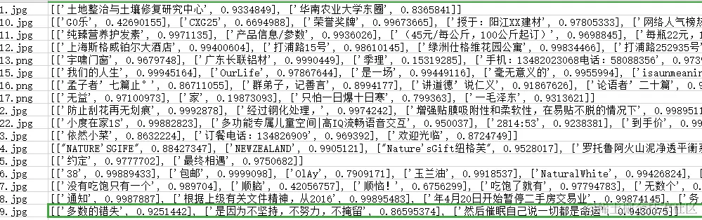 该模型识别出了35段文字,总体来说和paddle差不多,但是置信度上却相差了一大截,chineseocr_lite置信度最高0.59,大部分是0.3~0.5之前的。