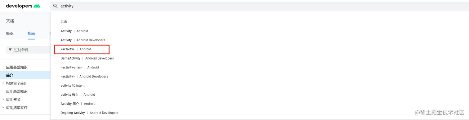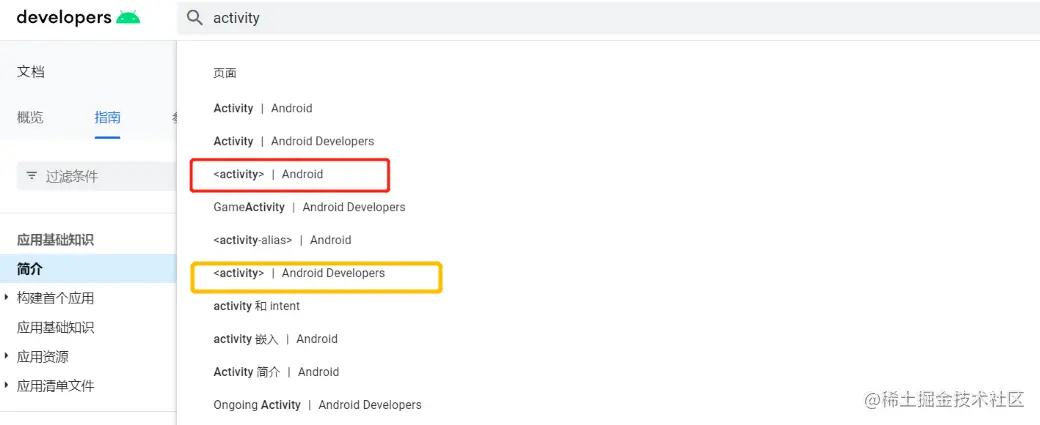 注意:Android开发者指南里面的很多文章已经有了中文版本,比如我们刚刚看的这篇。你也可以直接查看对应的英文版本,在一开始搜索的时候选择Android Developers跳转就可以了。