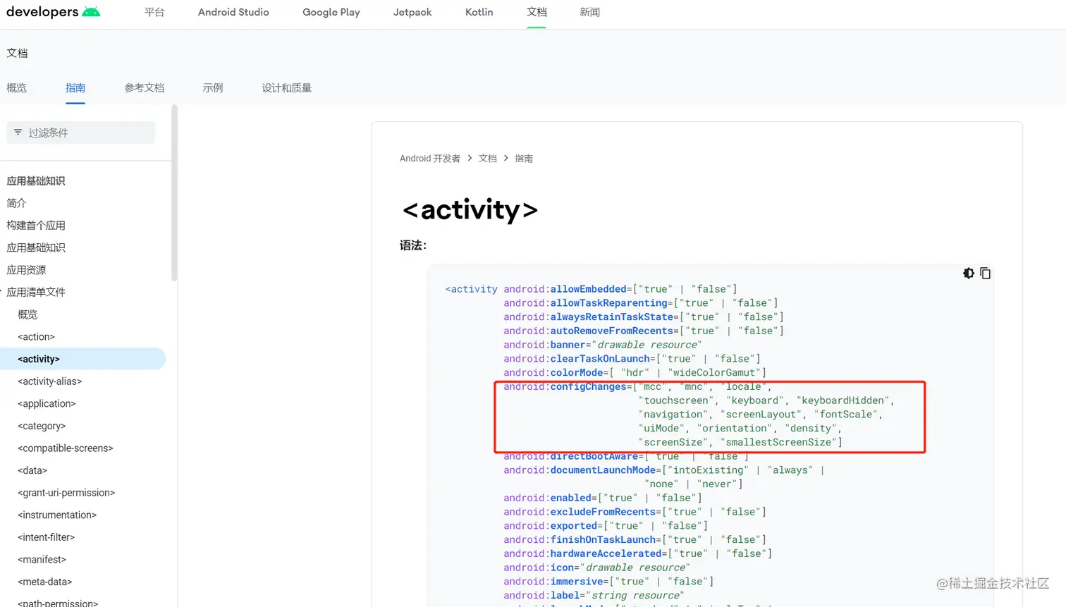 打开官网,直接搜索**configChanges关键字,**显示没有与您的查询相关的建议。不慌,查询上一层activity。如下,搜索到,点击跳转。