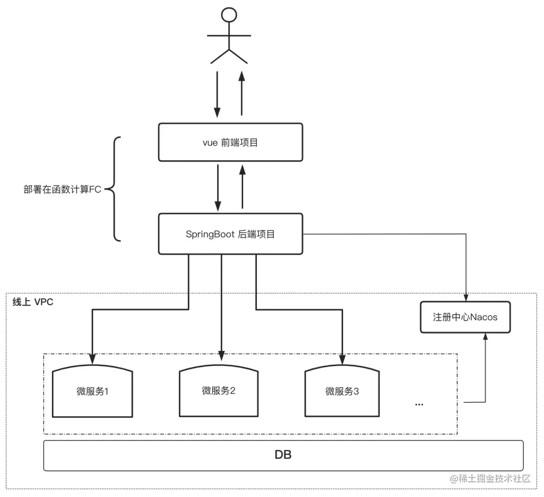 小王将迭代最频繁的对外的前后端分离的项目都一键迁移到函数计算的 Custom Runtime,在其中 SpringBoot 的项目需要能使用各种 VPC 内网地址访问下游服务(比如注册中心或者其他微服务接口),这个时候Serverless Devs 提供的端云联调**[3]**就可以派上用场了, 只需要在 s.yaml (s.yaml 中定义了函数的 VPC 配置) 所在目录下执行: