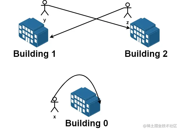 从楼 0 离开的员工为 x 和 y ,且他们都想要搬到楼 1 。
