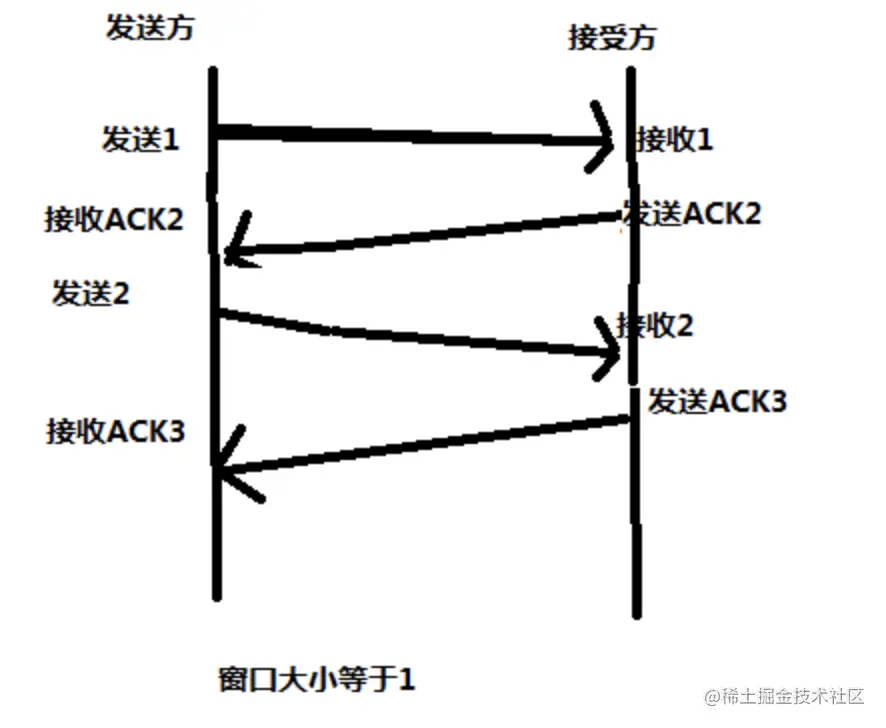 我们假设这个固定窗口的大小为1,也就是每次只能发送一个数据,只有接收方对这个数据进行了确认后才能发送第二个数据。在图中我们可以看到,发送方每发送一个数据接收方就要给发送方一个ACK对这个数据进行确认。只有接收了这个确认数据以后发送方才能传输下个数据。