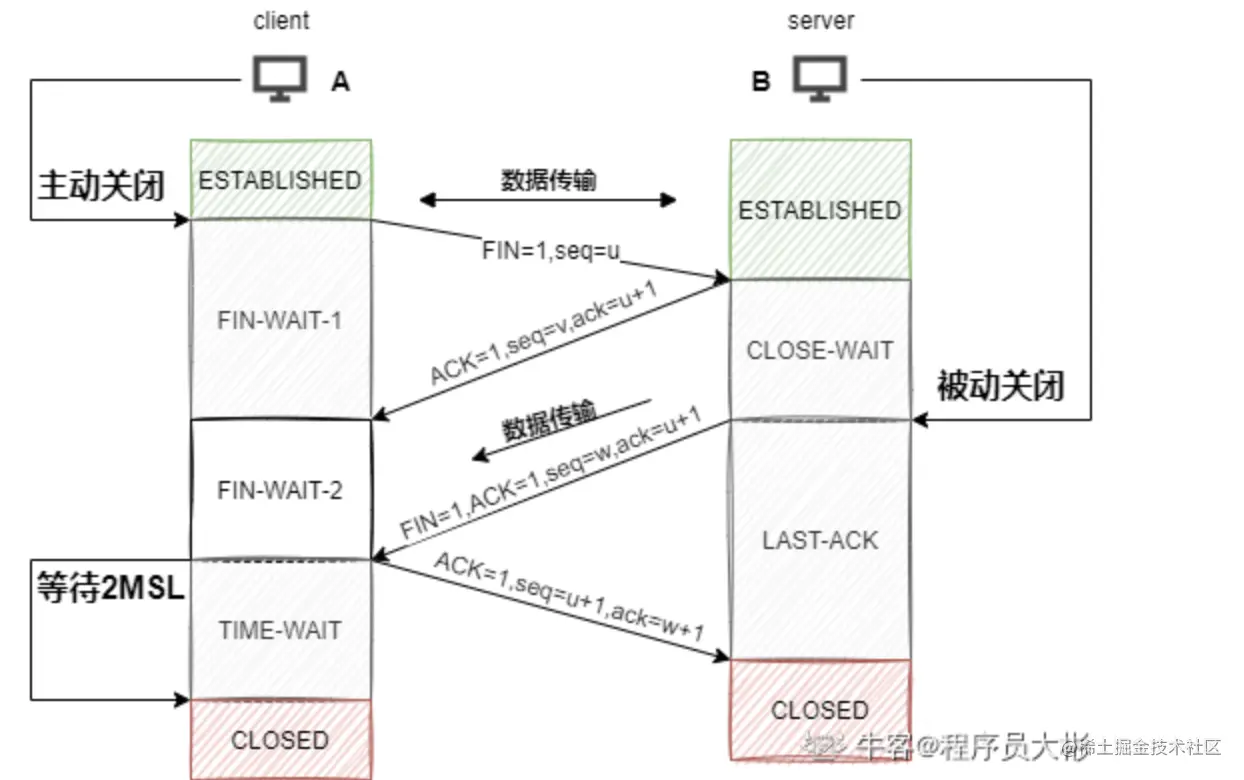 - A收到B的确认信号,并向B发送确认信号:A——>B。