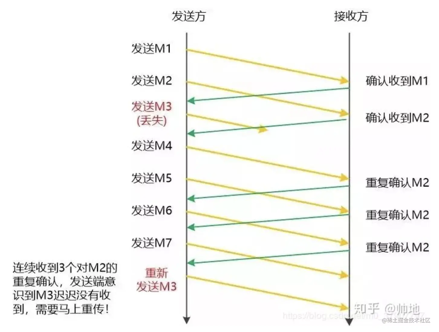 为了防止这种情况,我们是通过冗余 ACK来处理的。我们都知道,数据包是有序号的,如果A给B发送M1, M2, M3, M4, M5...N个数据包,如果B收到了M1, M2, M4....却始终没有收到M3,这个时候就会重复确认M2,意在告诉A,M3还没收到,可能是丢失