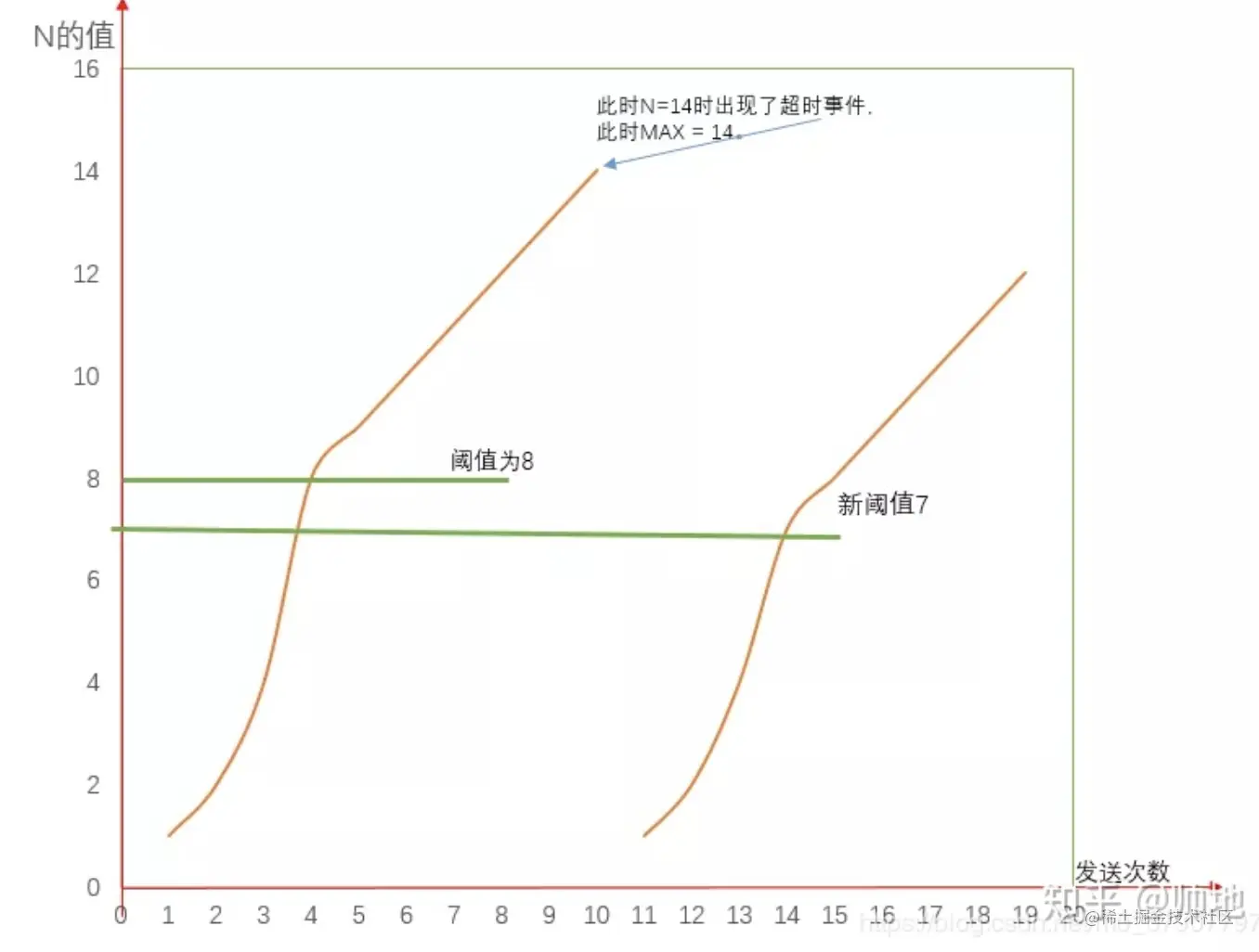 图中阈值为8,瓶颈值是14;超时事件发生后,阈值为14 / 2 = 7。