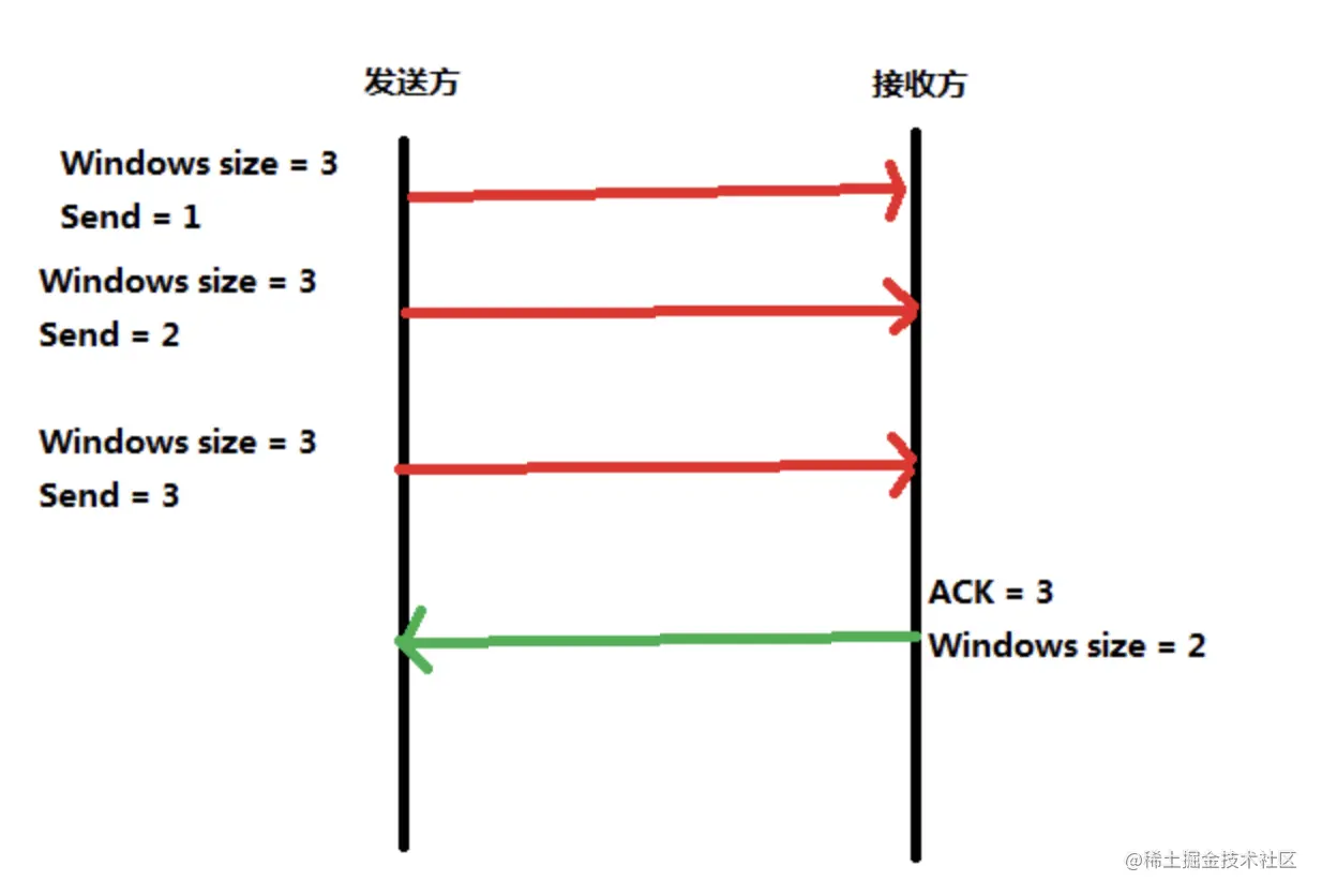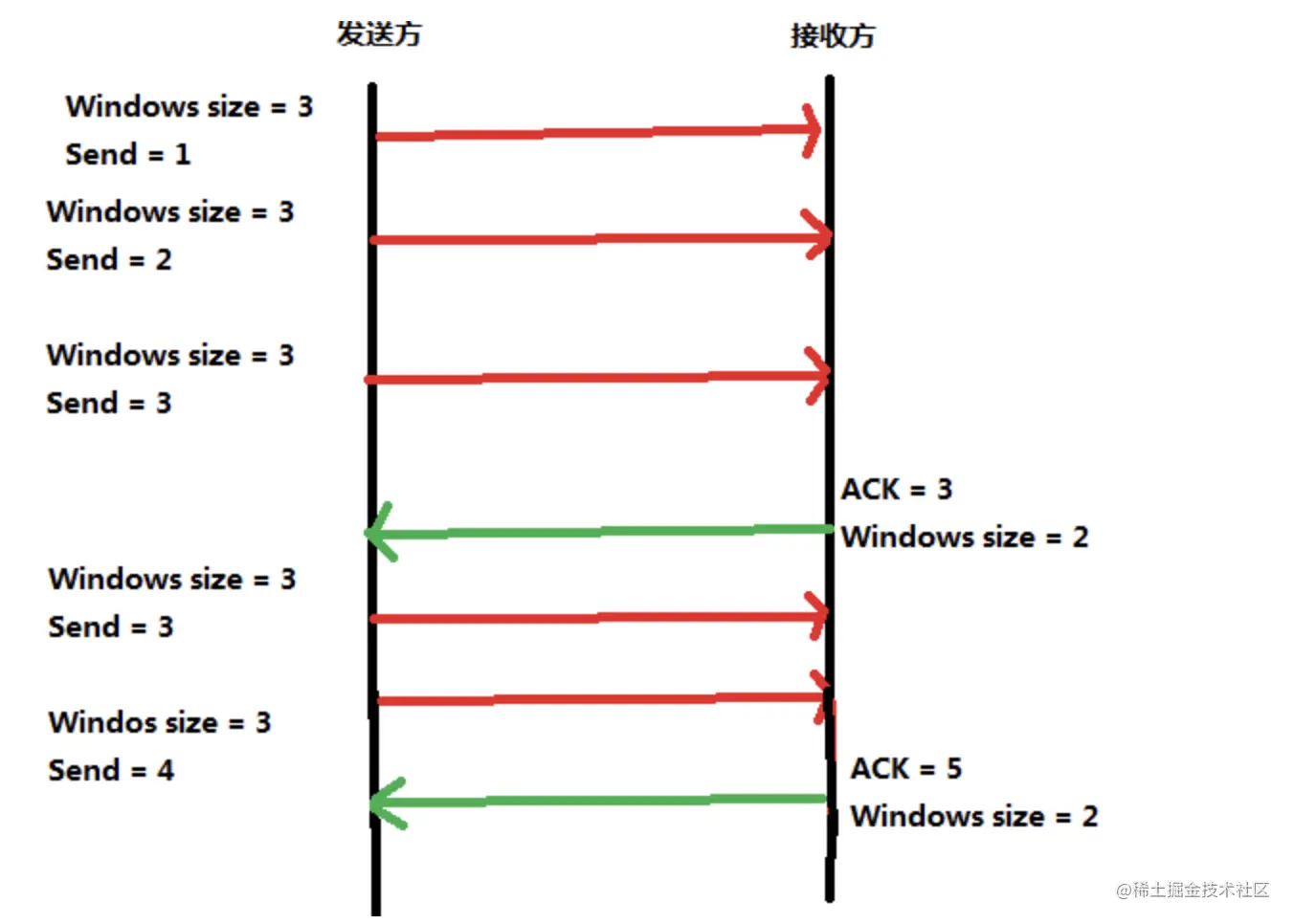 在上图中:我们看到接收方发送的ACK = 3(这是对发送方发送序列2的回答确认,下一次接收方期望接收到的是3序列信号),这个时候发送方收到这个数据以后就知道我第一次发送的3个数据对方只收到了两个,就知道第三个数据对方没有收到,下次返送的时候就从第3个数据开始发。这时候窗口大小就变为了2.