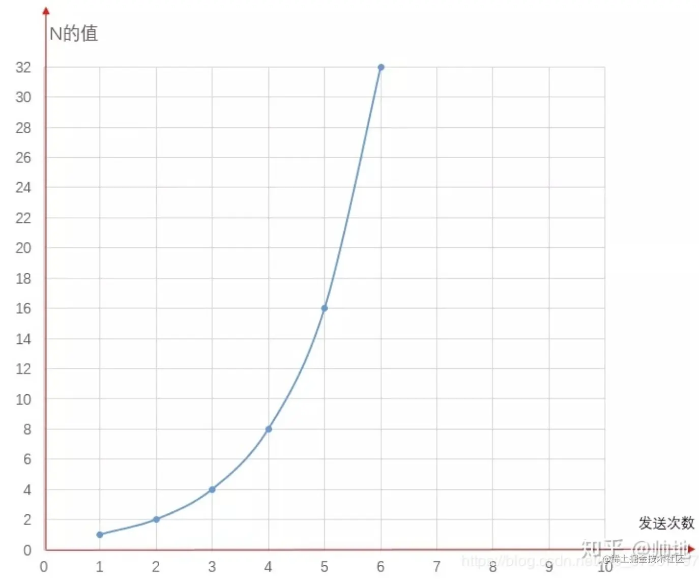 2、一个一个增加实在是太慢了,所以可以刚开始发送1个,如果没有发生超时时间,就发送2个,如果还是没有发送超时事件就发送4个,接着8个...,用翻倍的速度类推,即 N = 1, 2, 4, 8, 16...