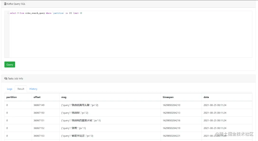 可以通过编写SQL语句,来查询(支持过滤条件)Topic中的消息记录,预览截图如下所示: