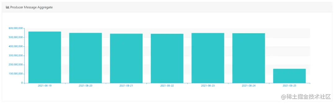 默认展示所有Topic的每天写入总量分布,可选择时间维度、Topic聚合维度,来查看写入量的分布情况,预览截图如下所示: