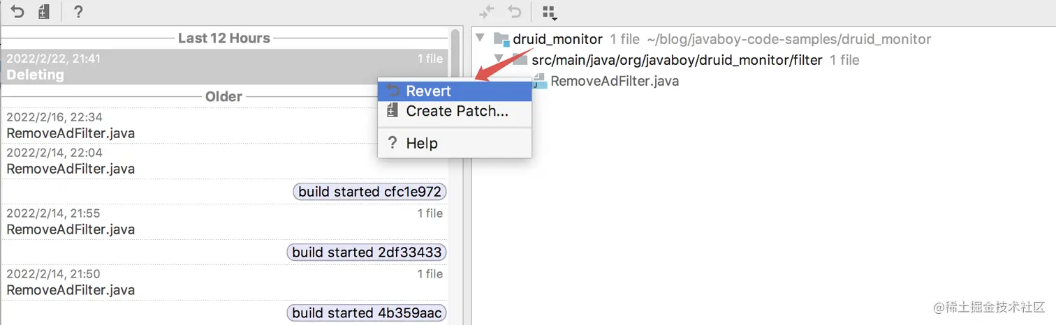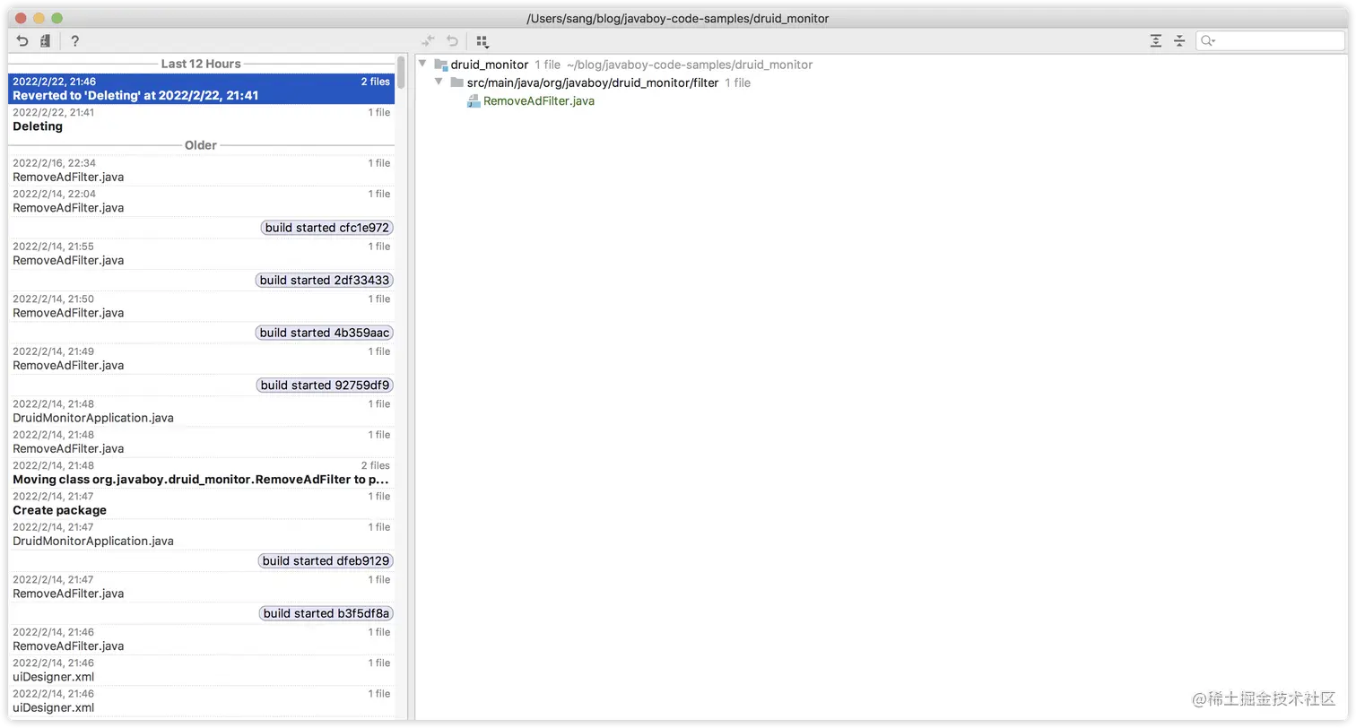 通过 IDEA 自带的 Local History 功能,我们恢复已经删除的文件,恢复某个文件的某一次更改或者将文件回滚到历史中的任意时刻,最为关键的是这一切不依赖版本控制工具。