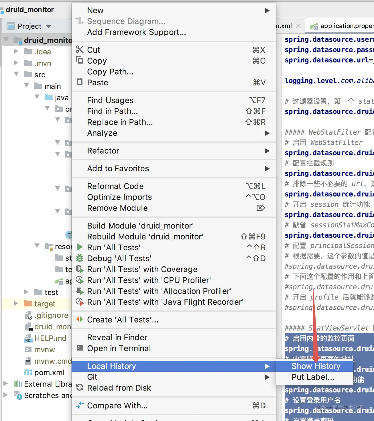 选中当前工程,右键单击,依次选择 Local History->Show History,如下图: