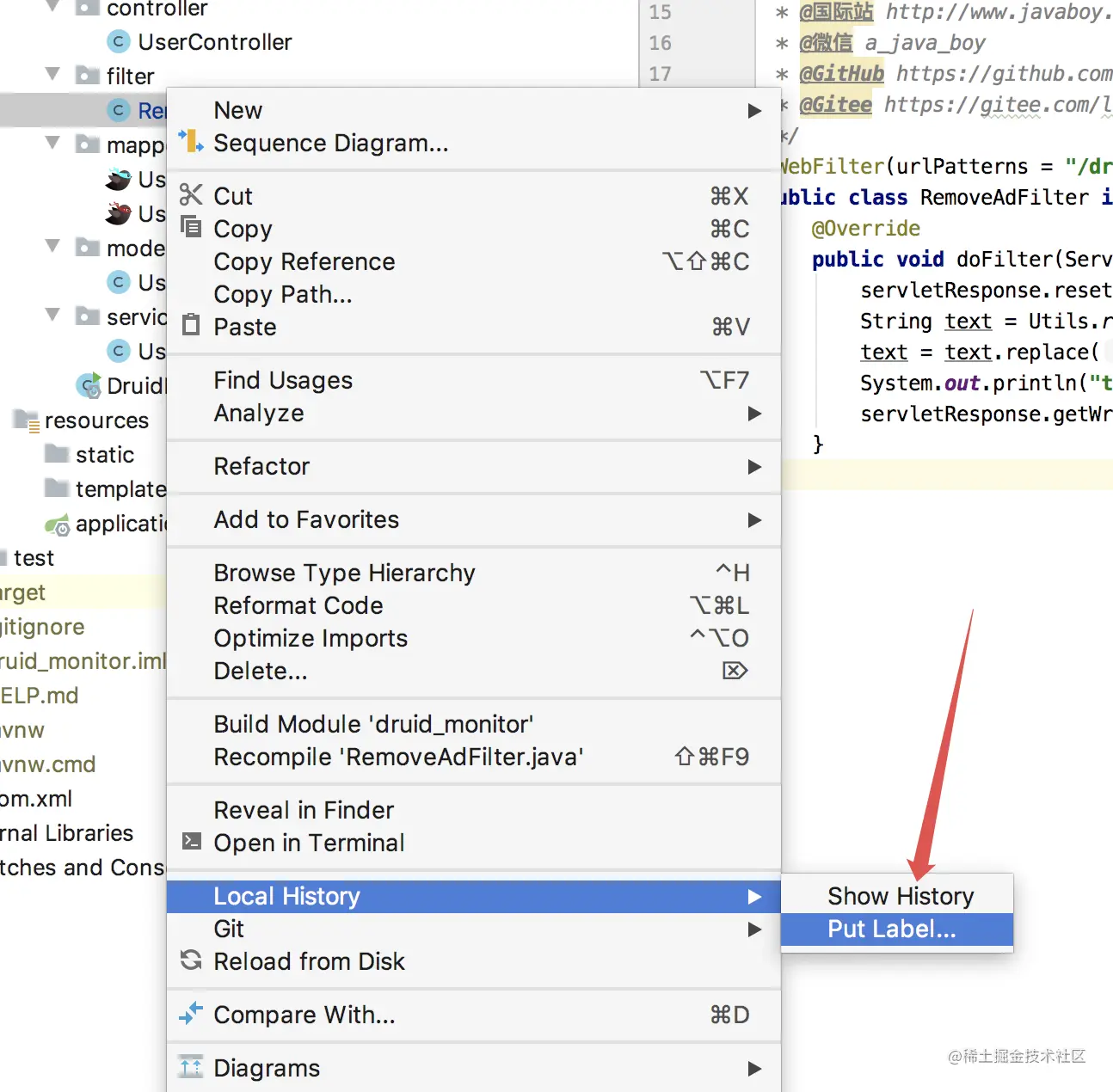 IDEA 中的 Local History 功能可以帮助我们不断跟踪对项目文件所作的更改,并且这个跟踪不受版本控制的影响,换句话说,无论你用不用 Git、Svn 等工具,IDEA 中的 Local History 功能都是可用的。